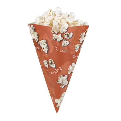 Conical popcorn packaging is the most inventive design for popcorn packaging. The conical shape of this packaging allows us to hold the popcorn properly without the tension of difficult packaging handling. You can easily carry it in your hands and enjoy the popcorn while walking down the street. This practical design has contributed to the design’s success.